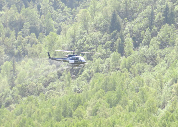 今年是我场首次使用直升飞机防治森林病虫害。飞防前,我场配合县森防站进行了线路勘察、虫情调查、飞机起降点选址、药物选配、广泛宣传等工作。飞防时,每架次装载药液600公斤,作业时速约60公里/小时,飞行高度距树冠15-20米,防带宽度50米。所喷洒的农药为国内先进的无公害生物制剂噻虫啉,同时添加一些沉降剂,均对人畜安全,不杀伤天敌和有益生物,利于生态平衡。